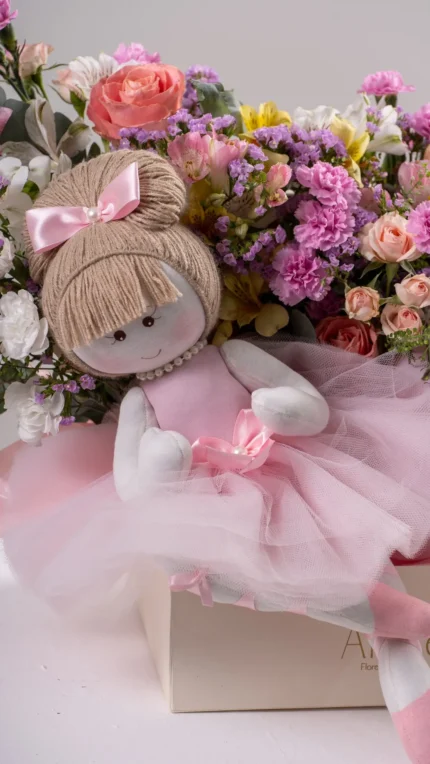 Delicadeza e sofisticação em um único presente. Nossa Box Maternidade com orquídea, boneca de pano artesanal e bolha personalizada é