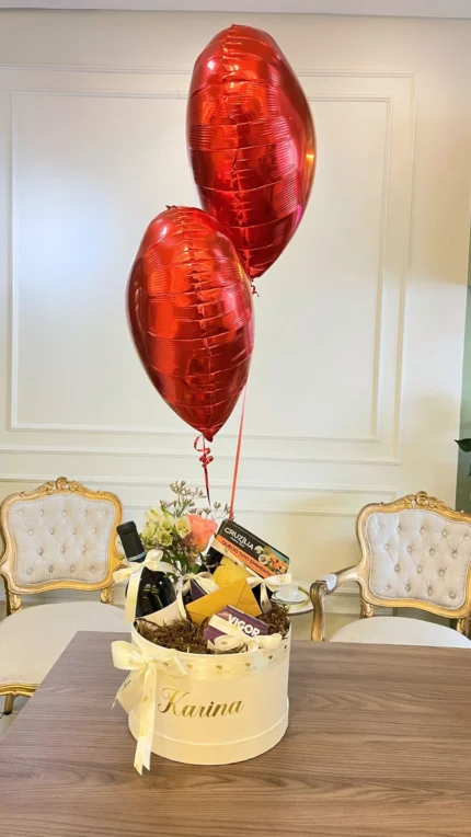Box personalizada com queijos, vinho, flores e balões