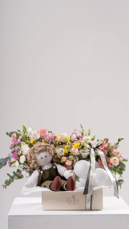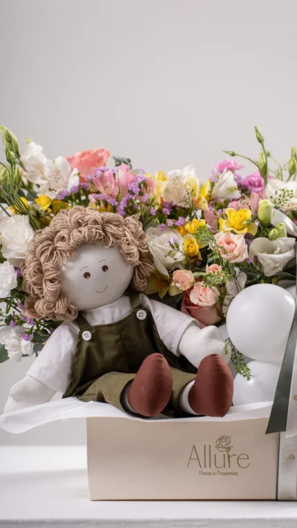 Perfeito para dar boas-vindas a um novo bebê, este modelo de Ballon Box Maternidade traz uma pelúcia fofinha, mini-ramalhete