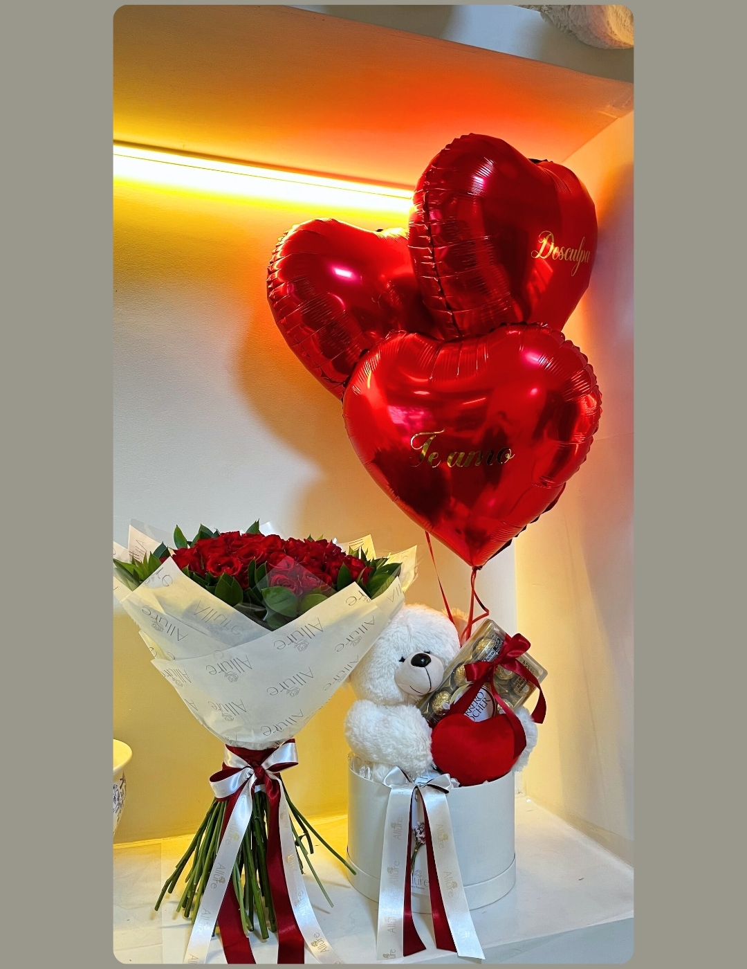 Buquê 40 rosas Allure, pelúcia média, Ferrero Rocher 12 un. em caixa personalizada e três balões flutuando com gás hélio