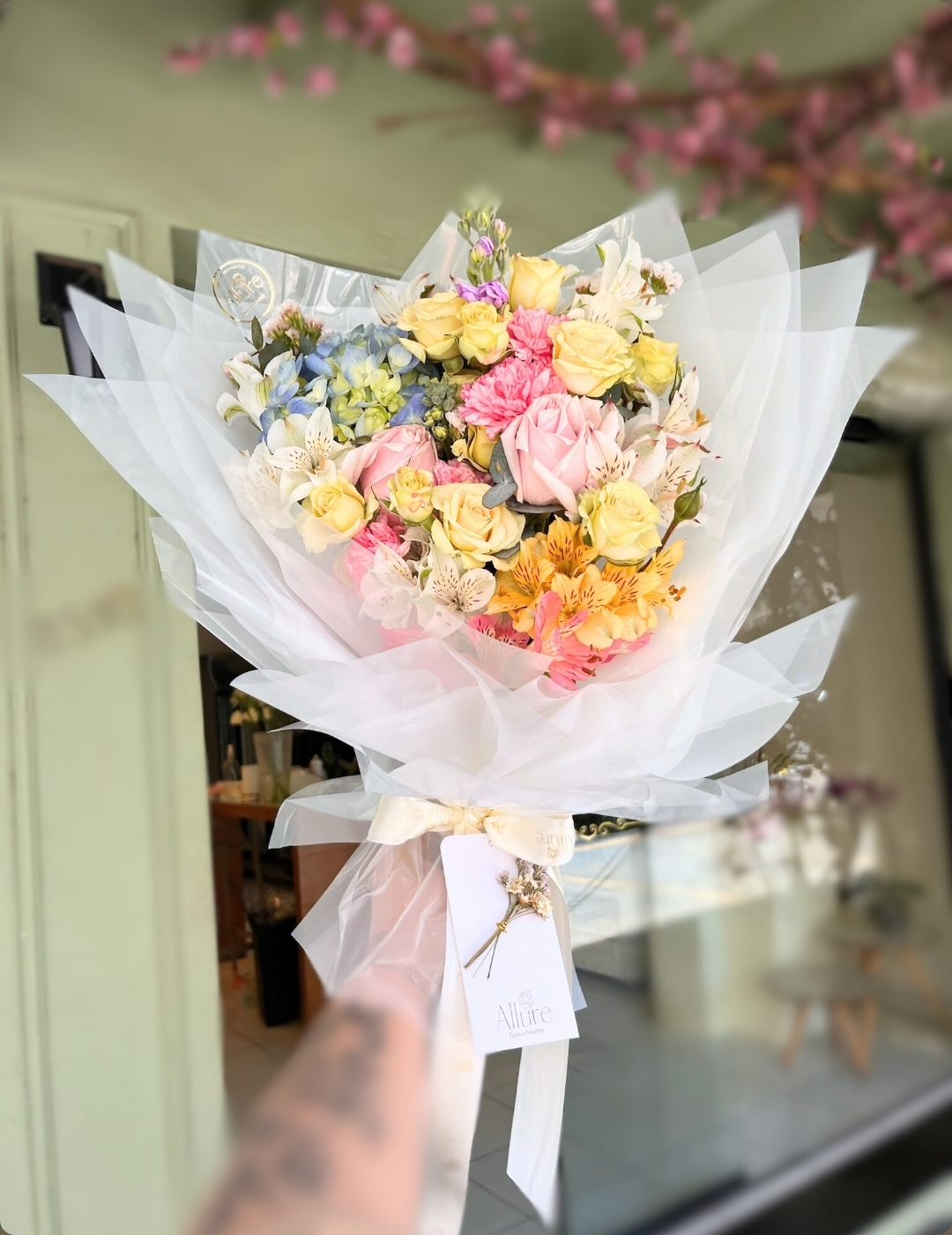 Com flores frescas selecionadas no dia, o Aurora apresenta proporção equilibrada e elegância natural, sendo a opção ideal para quem deseja surpreender com segurança e bom gosto.