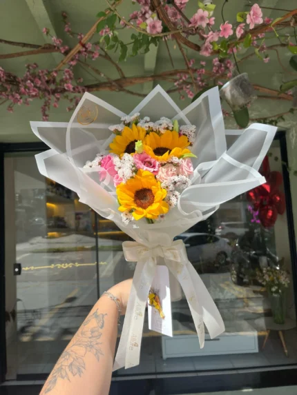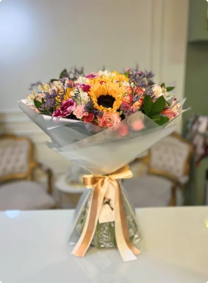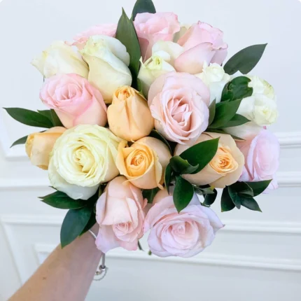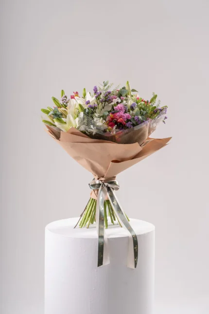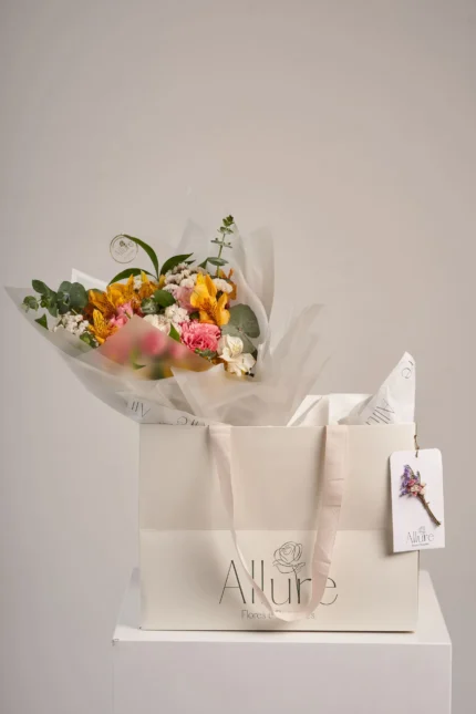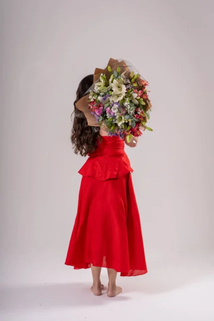 Buquê com doze rosas vermelhas, feito em papelaria exclusiva da Allure, com um foco especial nas rosas. Pontos de ruscus ou eucalipto, a depender da época do ano.
