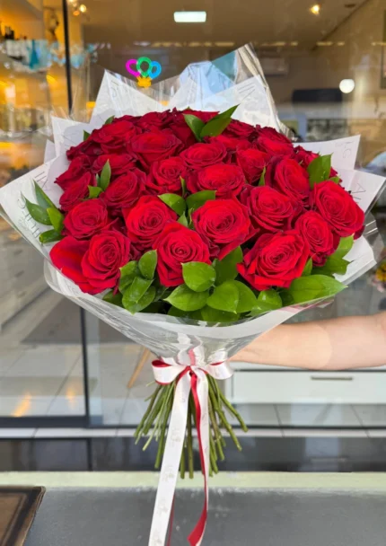 Buquê Conquista com 40 rosas vermelhas envolta em ruscus