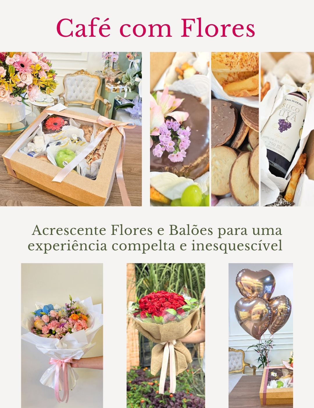Café com flores, Buquê Aurora e balões R$ 817,00