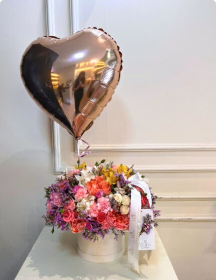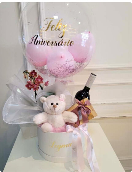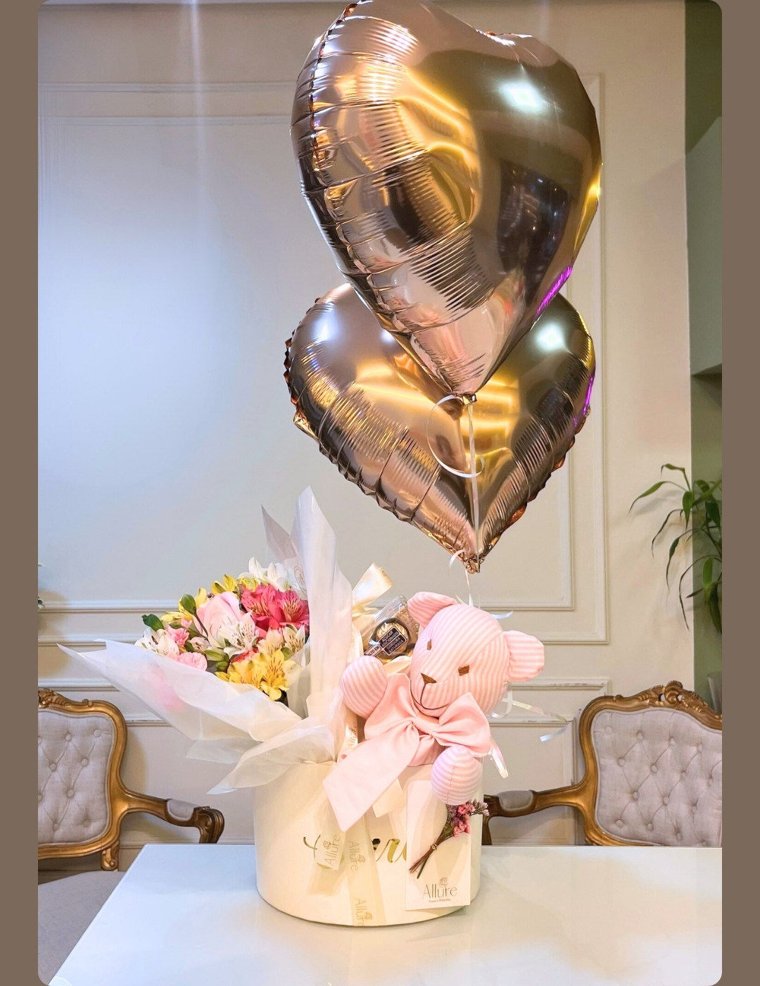 Ramalhete de flores, boneco de pano listrado e dois balões flutuando